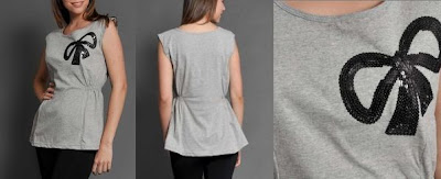 em malha com decote redondo, aplicação de laço em paetês e elástico na cintura